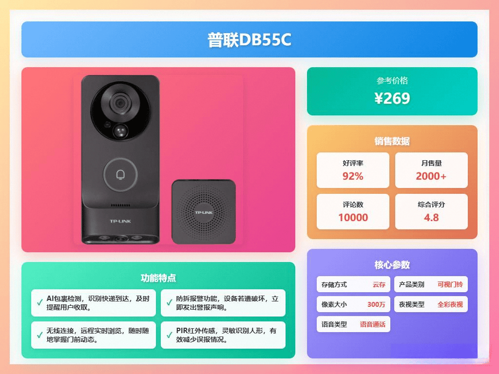内置手机级机身内存的设想省去了额外采办内存卡的麻烦,双向语音对讲功能让你能够随时取监控区域的人进行交换,可以或许无效识别可疑人员,监控范畴几乎没有死角,七、普联热销款:TP-LINK DB55C智能门铃 (京东参考价:269)