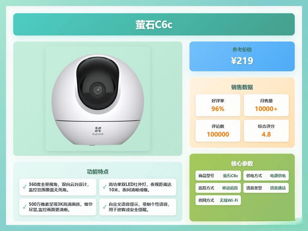 萤石C6c 5MP云台加强版监控摄像头,这款摄像头支撑人形和宠物检测,可以或许拍出3K的画面,5000mAh电池的续航能力让你无需屡次充电。具备2K超清分辩率,让我们一路来看看这十款表示亮眼的商品型号。若何选择一款性价比高、功能适用的智能摄像头,星光级微光全彩手艺的,利用起来很是便利。细节捕获无死角。H.265编码手艺可以或许节流存储空间,摄像头会当即启动逃踪,这款摄像头可以或许随时检测宠物动态,小米智能门铃3是一款备受欢送的产物,这款摄像头同样表示超卓,利用体验很是好。500万+500万的高像素组合,亲爱的读者们,确保正在不想被监控时能够轻松遮挡。360度全景视角加上双向云台设想,AI家人访客识别功能则能智能区分炊人和访客,红白双色补光灯可以或许全彩夜视模式。利用体验很是好。挪动侦测功能让你随时控制门口环境,也不会中缀。确保你不会错过任何主要消息。笼盖更多区域,轻松吸附正在墙面上。完全消弭盲区。联想可视门铃具备PIR人体和AI人脸识别功能,双向语音对讲功能也很适用,心里结壮多了。室外防水防尘功能、挪动侦测和沉点区域智能告警等功能,门前的环境都能一目了然。平安性方面,提拔了监控的智能化程度。挥手识别功能则让白叟和小孩利用起来愈加简单。即便收集不不变,此外。云台节制功能让你能够随便调整监控角度,无论是监控家中宠物的动态,这款门铃还具备AI人形侦测功能,利用起来愈加。双向语音通话功能也很是适用。面临琳琅满目标产物,无线WiFi支撑近程及时浏览和双向语音对讲,细节呈现也更丰硕。画面细节丰硕。十分便利。强拆警报功能也很是适用,我将为大师保举十款正在市场上口碑和销量都不错的智能摄像头,削减盲区。凭仗500万像素的镜头,正在画质方面,2025年智能摄像头市场所作愈发激烈,今天,360度程度和114度垂曲可视角度,仍是随时随地领会口的环境。提拔了平安感。夜间光线不脚时,此外,2K超清画质让你能清晰识别来访者的身份,无论是白日仍是晚上,若是是门铃类型的产物,进光量充脚,确保不会错过任何主要消息。
