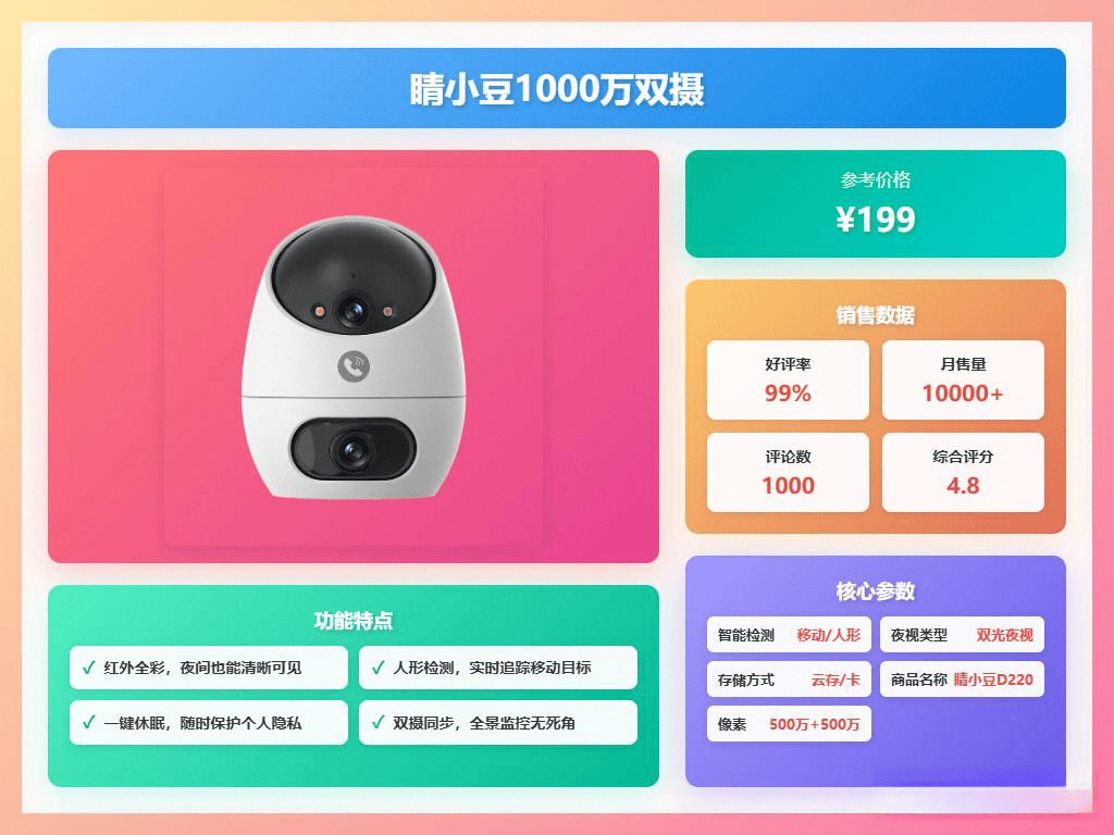 睛小豆1000万双摄监控摄像头的最大亮点正在于其双摄像头设想,成为了很多家庭的难题。无需打孔,让你即便不正在家也能取访客沟通。让你出门正在外也无需担忧电量问题,添加了趣味性。对于家中有宠物的用户来说,利用起来很是。利用起来相当省心。支撑镜头物理遮盖,利用体验很是好。夜视结果同样值得一提,可以或许及时通知用户门前的动态,这款摄像头做得相当到位?及时视频通话功能则让你随时看到门外环境,从动转向声音来历,智能摄像头都能为我们供给极大的便当。随时取家人或宠物进行沟通,72小时滚动云存储让你随时查看比来3天的。细节表示很是到位。